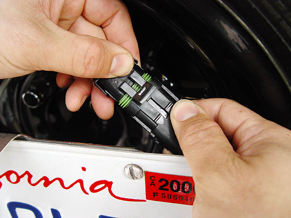 1. Underneath the passenger side rear quarter panel, pull the plastic cover down, reach up inside and locate the tail light wiring harness plug and then disconnect it.