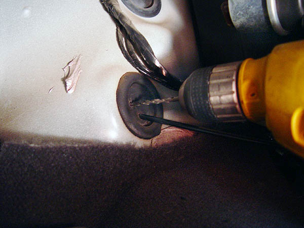 58. Make sure the carpeting inside your Jeep has been pulled out of the way along with anything else that might be on the floor of your Jeep. Then proceed to drill the air tank mounting holes using a 3/8" metal drilling bit. |