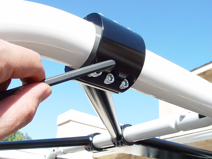 | 15. Using a 1/4" allen wrench, loosely secure your Rock Hard Ultimate Sport Cage top/center T-bars to your Jeep's side support bars using 2 small clamp ends and allen bolts supplied with the kit. |