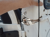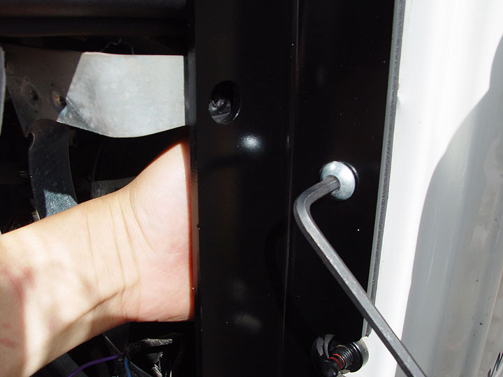 27. Using a Torx T-40 bit, remove the bolts on the outside bottom corner of the windshield frame as shown in the pic to the left. Then, remove the bolts securing the side support bars to your windshield frame. You should now be able to fold your windshield down. |