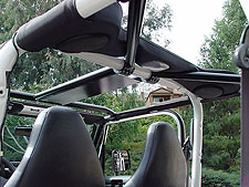 28. Place the Rock Hard Ultimate Sport Cage dash bar between the windshield side bars facing forward and pointing down. Then, secure it loosely in place using the small clamps and bolts supplied with the kit. A 1/4" allen wrench will be required to do this. |