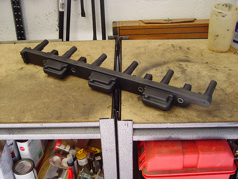9. With all the bolts removed and the wiring harness disconnected, carefully remove your Jeep's coil rail out from the engine compartment. |