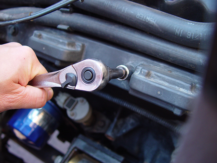 5. Using a 13mm socket and a ratchet drive extension, remove the 4 bolts securing your Jeep's coil rail to the engine. |