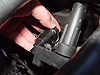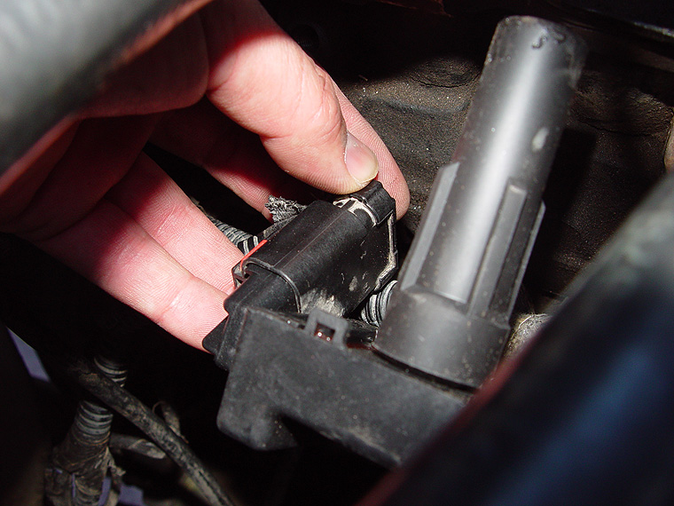 8. The wiring harness plug has a secondary release lock tab that will need to be depressed as you pull it off. The pic above is of the connecting plug after the coil rail has been disconnected to show you what to look for. |