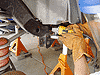 60. As before, using an electric grinder to create a deep score all the way around the factory lower control frame mount just beneath the weld. Then, cut through the base of the frame mount all the way up to the score. |