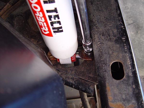 78. Using a 13mm socket and a 12" ratchet extension, remove the bolts securing your Jeep's rear shocks from the upper frame mounts. Save the hardware as they will be reused. |