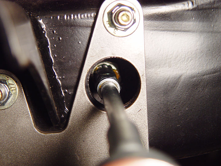 | 146. Using a 9/16" socket, remove the banjo bolt securing your Jeep's rubber brake line to the caliper. This will be a bit messy so be sure to have some rags handy. |