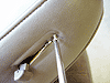| 4. Push back the vinyl upholstery next to the recliner lever in order to expose the plastic locking tab holding it in place. Carefully lift up this tab with a small flat head screwdriver and pull the plastic lever off. |